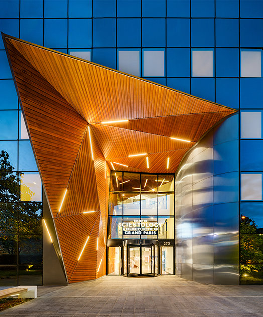 Among the facility’s striking architectural features are its gleaming glass exterior, comprising more than 1,500 reflective panes, and a modern geometric wood portal—all to welcome Parisians to the extraordinary adventure of true spiritual liberté.