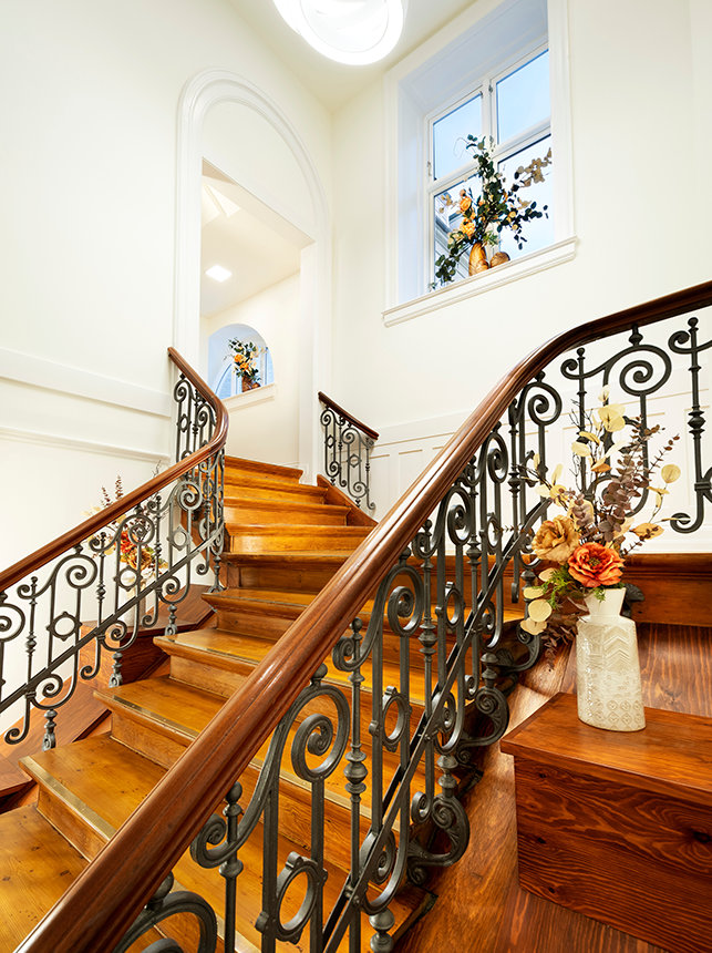 Rising six stories above Reception is the building’s stunning grand atrium. The design was inspired by the sequoia, including the circular stairwell lined with an intricate leaf pattern.